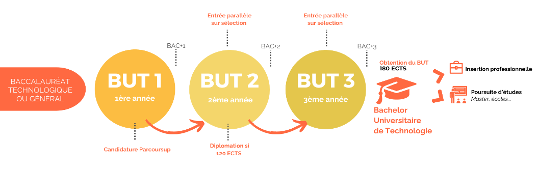 - Une validation des semestres sous forme de crédits ECTS (European Credit Transfer System) avec un total de 180 crédits pour valider le BUT