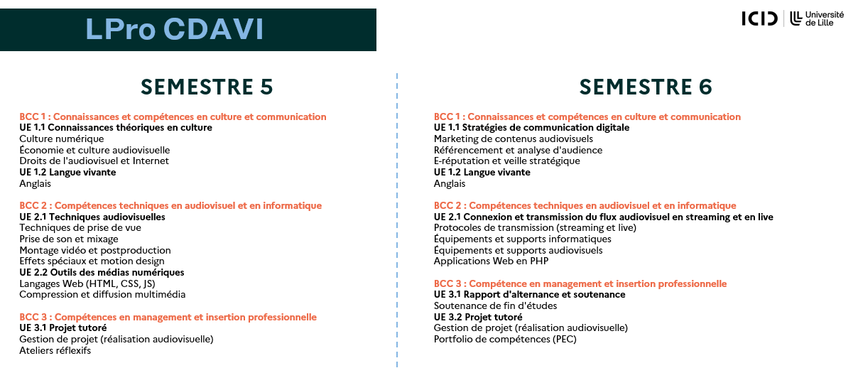 Les enseignements de la licence professionnelle CDAVI sont organisés autour de 3 blocs de connaissances et de compétences (BCC). Chaque BCC représente un ensemble homogène et cohérent d’enseignements visant des connaissances et des compétences complémentaires qui répondent à un objectif précis de formation.