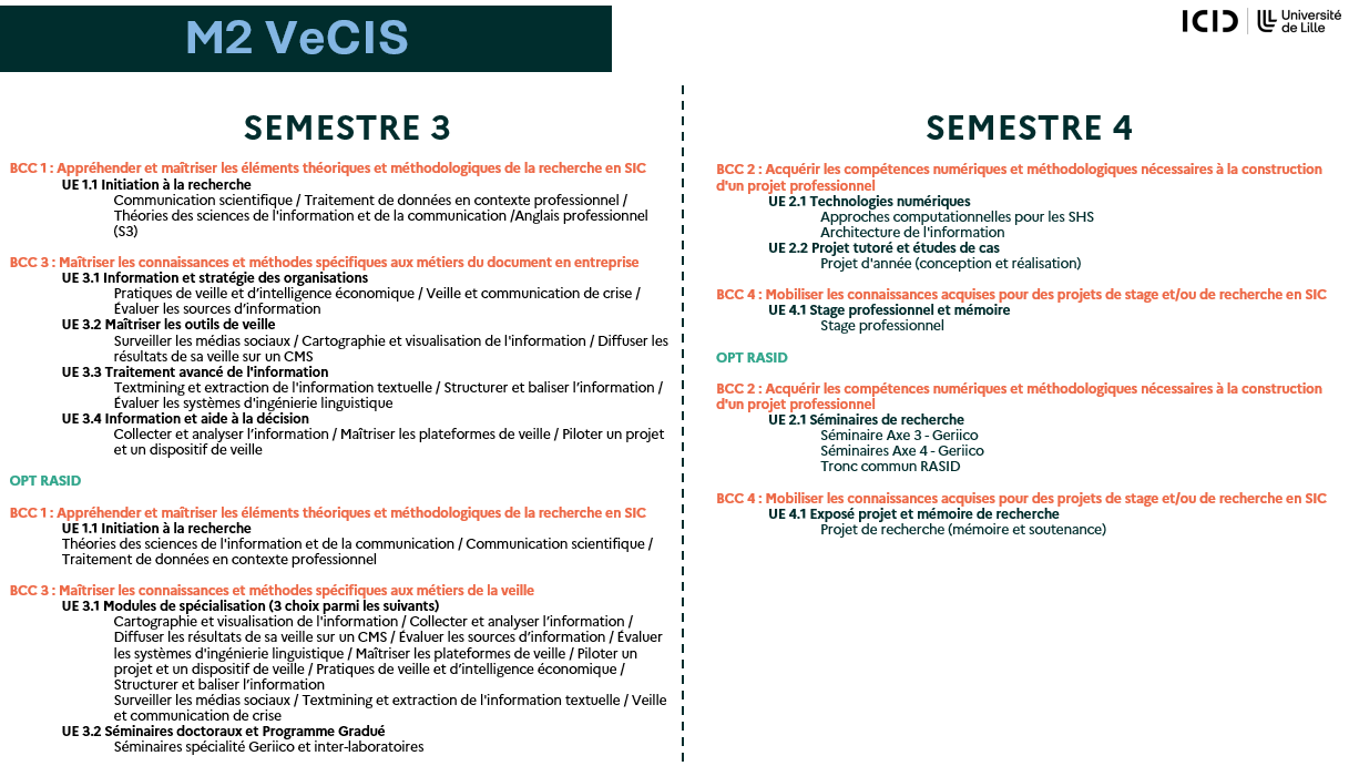 Les enseignements du master sont organisés autour de Blocs de Connaissances et de Compétences (BCC) .